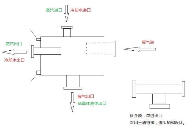 如圖設計所示,假設其中廢氣通道為 A 通道,100℃廢氣從右側進口進入,經過冷卻循環從底部出口流出,此時另一個 B 通道(左側和上端)為冷介質(常溫水),用以冷卻廢氣,使之在換熱器內部 A 通道表面凝結成晶體,飽和之后,關閉廢氣進口,原 B 通道的冷介質,改為熱介質(蒸汽)進行對 A 通道的加熱,使 A 通道的硝基苯晶體溶解成液態回收。