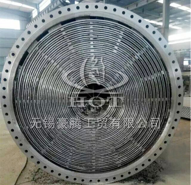 如上圖就是用于廢氣冷卻的單面可拆式不銹鋼螺旋板換熱器的實拍圖片。同樣的,如介質雜質較多的液體也同樣適用。